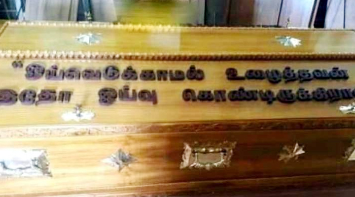 ‘విరామమన్నది ఎరుగక, నిరంతరం కృషి చేసిన వ్యక్తి ఇక్కడ విశ్రమిస్తున్నాడు’. ఈ మాటలు కరుణానిధికి వర్తించినంతగా ఎవరికీ వర్తించవేమో.. అందుకే శాశ్వత నిద్రలోకి జారుకుని విశ్రమిస్తోన్న ‘కలైజ్ఞర్’ శవపేటిక మీద తమిళంలో ఈ మాటలనే చెక్కించారు. ఒకానొక సందర్భంలో కరుణానిధి తన కుమారుడు స్టాలిన్తో ‘మన సమాధి చూసిన జనాలు విశ్రాంతి అన్నది ఎరగకుండా పనిచేసిన వ్యక్తి ప్రస్తుతం ఇక్కడ సేద తీరుతున్నారని’ అనుకోవాలని చెప్పారట. ఈ మాటలు కరుణానిధికి సరిగ్గా సరిపోతాయి. అందుకే ఆయన శవ పేటికి మీద కొడుకు స్టాలిన్తో చెప్పిన వ్యాఖ్యాలను చెక్కించారు.