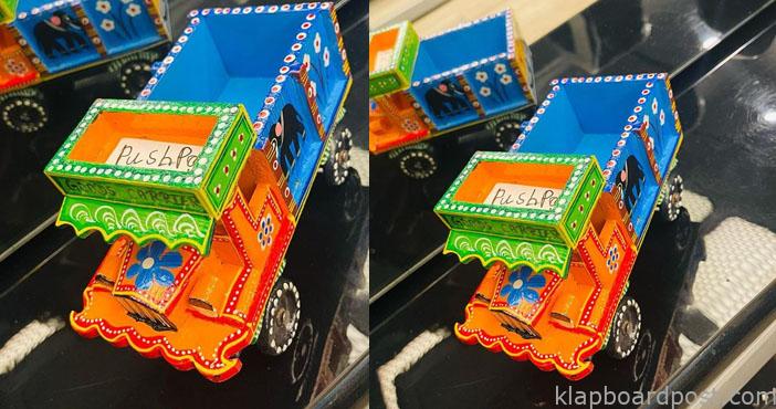 Today he took to social media to share a picture which shows a small truck which has been made by his son Ayaan. It is a cute gift and the way Ayaan has written Pushpa on it looks quite good.
