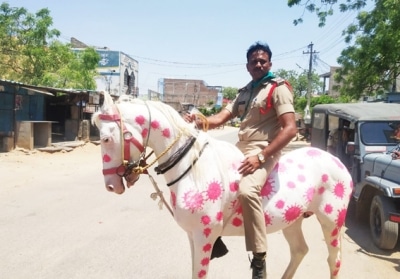 A police official in Andhra Pradesh has come up with a unique awareness drive on coronavirus. Sub-inspector Maruthi Shankar took out awareness drive by riding on a horse which was splattered with red dotts all over the body. The situation was spotted at Peapully, in Kurnool district, where the officer was seen making announcement on loudspeaker to stay safe on COVID-19.