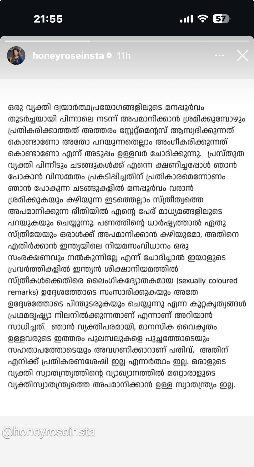 కానీ ఎన్నో ఈవెంట్లలో గెస్ట్గా పాల్గొని మంచి ఆదాయాన్ని సంపాదించుకుంటూ ఉంటుంది ఈ హీరోయిన్. అయితే, తాజాగా ఆమె తనకు ఎదురైన లైంగిక వేధింపులపై సోషల్ మీడియా ద్వారా తీవ్ర అసహనాన్ని వ్యక్తం చేసింది. ఈ పోస్ట్ లో హనీ రోజ్, ఒక ప్రముఖ బిజినెస్ మాన్ నుండి ఎదురైనా లైంగిక వేధింపులను వివరించింది.