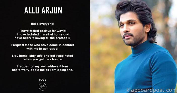 కరోనా సెకండ్ వేవ్ దేశంలో విజృంభిస్తుంది. టాలీవుడ్లో కరోనా కల్లోలం కొనసాగుతోంది. ఇప్పటికే పలువురు స్టార్ హీరోలు, ప్రొడ్యూసర్లు, ఇతర నటీనటులు వైరస్ బారినపడగా తాజాగా స్టైలిష్ స్టార్ అల్లు అర్జున్ సైతం ఆ జాబితాలో చేరారు. ఈ విషయాన్ని తెలియజేస్తూ తాజాగా ఆయన ఓ ట్వీట్ పెట్టారు.