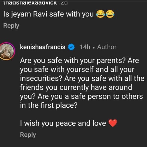 After speculations about a romance between Kenishaa and Jayam Ravi surfaced, social media users began flooding her Instagram with mocking comments. One comment specifically asked, “Is Jayam Ravi safe with you?” In response, Kenishaa took a calm yet pointed approach, replying, “Are you safe with your parents? Are you safe with yourself and all your insecurities? Are you safe with all the friends you have currently around you? Are you a safe person to others in the first place? I wish you peace and love.”