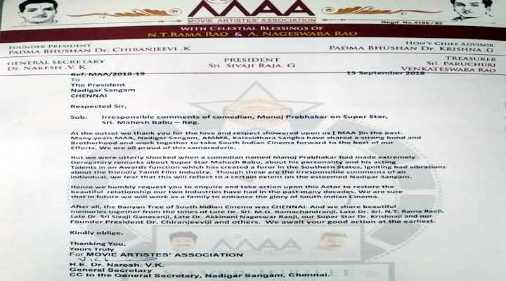 టాలీవుడ్ సూపర్ స్టార్ మహేష్ బాబుపై అనుచిత వ్యాఖ్యలు చేసిన తమిళ కమెడియన్ మనోజ్ ప్రభాకర్పై విమర్శలు వెళ్లువెత్తుతున్నాయి. ఇప్పటికే మనోజ్.. ఫేస్బుక్ పోస్ట్తో పాటు ఓ వీడియో సందేశం రూపంలో క్షమాపణ కోరినా.. అభిమానులు శాంతించటం లేదు. తాజాగా ఈ వివాదం పై మూవీ ఆర్టిస్ట్ అసోషియేషన్ కూడా తీవ్రంగా స్పందించింది.