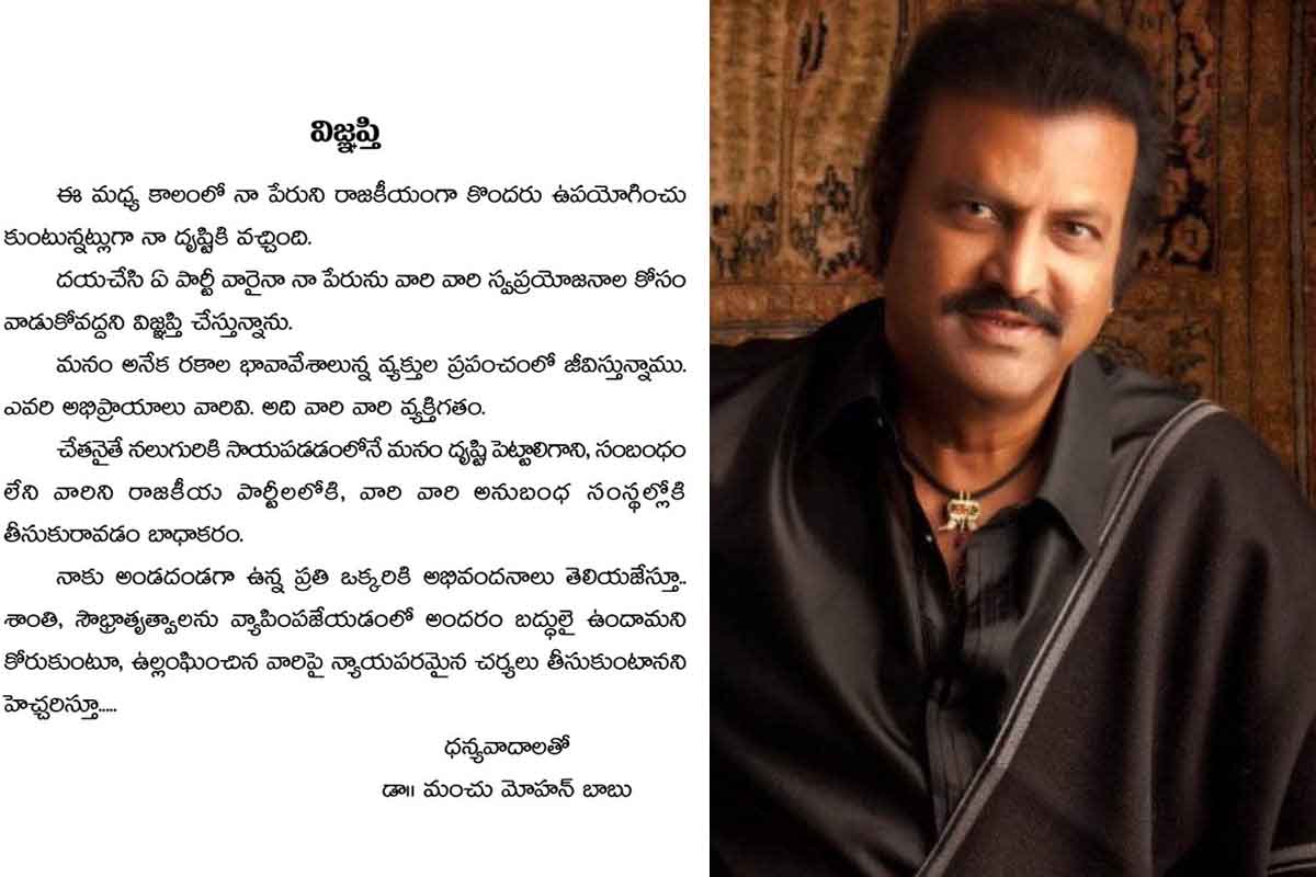 With the upcoming AP elections, something bothered the actor from ‘Pedarayudu.’ Mohan Babu addressed the issue by releasing a statement, stating, “Recently, some people in politics have been using my name. I urge them not to involve my name in political matters. We encounter many people with different thoughts and beliefs. Everyone has the right to their opinion, and it’s a personal matter.”