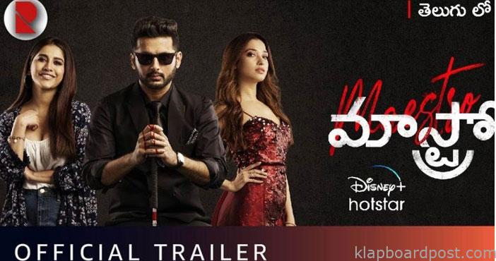 టాలీవుడ్ యంగ్ హీరో నితిన్ నటిస్తున్న 30వ చిత్రం ‘మ్యాస్ట్రో’. నభా నటేశ్ హీరోయిన్గా నటిచింది ఈ సినిమాలో మిల్కీ బ్యూటీ తమన్నా కీలక పాత్ర పోషించింది. ఈ సినిమాకి మేర్లపాక గాంధీ దర్శకత్వం వహించారు. ఈ చిత్రం త్వరలోనే ప్రముఖ ఓటీటీ డిస్నీ+ హాట్స్టార్ వేదికగా స్ట్రీమింగ్ కానుంది. ఈ సందర్భంగా చిత్రబృందం ట్రైలర్ను విడుదల చేసింది. ఈ ట్రైలర్లో అంధుడిగా పాత్రలో నితిన్ నటన మెప్పిస్తోంది.