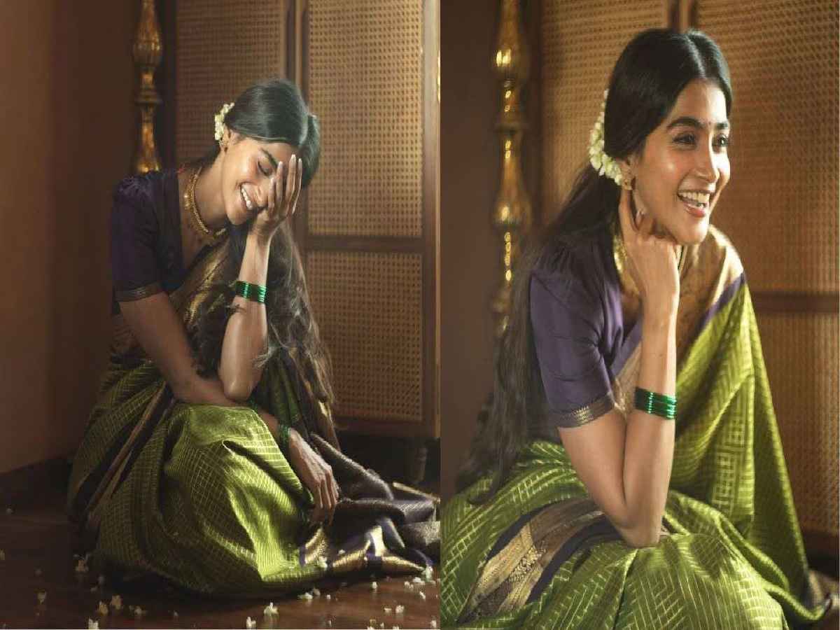 దీనికి గోల్డ్ నెక్లెస్, కంప్లీమెంటరీ ఈరింగ్స్, గ్రీన్ బ్యాంగిల్స్ వేసుకొని పూజా సదరు లుక్ని మరింత ప్రత్యేకంగా మార్చుకుంది. మధ్యలో భాగం విడదీసి ఓపెన్ హేర్ స్టైల్తో గజ్రా వేసుకుని పక్కా సౌత్ లుక్ను సెట్ చేసింది.
