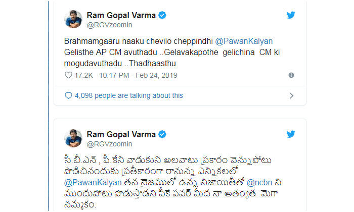 Controversy’s favourite child Ram Gopal Varma has done unthinkable act. Well, he hasn’t trained guns but rather appreciated. Yes, you read it right. RGV has hailed Jana Sena chief Pawan Kalyan and this has left all the PK fans go gaga. IN a series of tweets, RGV wrote, ” Chandrababu Naidu backstabbed NTR in the past, but Pawan Kalyan will do a frontstabbing to Chandrababu Naidu with his honesty.”