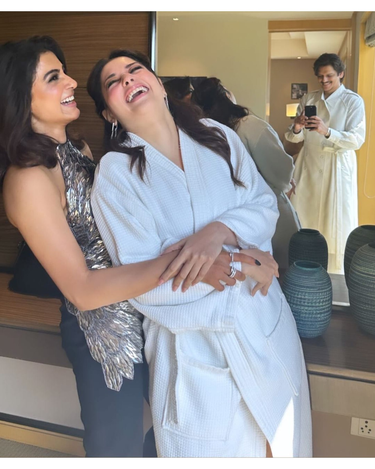 Another picture from the event captured Vijay Varma’s playful spirit, as he posed alongside Samantha and Tamanna in the mirror taking their pics. Samantha playfully tagged the couple as “love birds.”