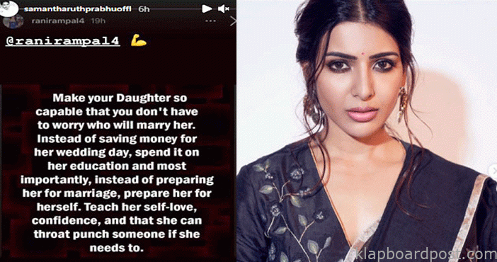 స్టార్ హీరోయిన్ సమంత ‘పెళ్లి’ పై ఆసక్తికర వ్యాఖ్యలు చేసింది.. ఎలాంటి పరిస్థితులు ఎదురైనా సరే వాటిని తట్టుకుని నిలబడగలిగేలా ఆడపిల్లల్ని పెంచాలంటూ భారత మహిళా హాకీ జట్టు కెప్టెన్ రాణి రాంపాల్ చేసిన పోస్ట్ని సామ్ షేర్ చేశారు. “మీ కుమార్తెను ఎవరు పెళ్లి చేసుకుంటారు? అని చింతించకుండా ఆమెను శక్తివంతంగా తీర్చిదిద్దండి. కుమార్తె పెళ్లి కోసం డబ్బు దాచిపెట్టడానికి బదులు ఆమె చదువుపై ఖర్చుపెట్టండి. ముఖ్యంగా పెళ్లికి ఆమెను సన్నద్ధం చేయడానికి బదులు.. తన కాళ్లపై తాను నిలబడగలిగేలా చేయండి. తనని తాను ప్రేమించుకోవడం, ఆత్మస్థైర్యంతో ఎలాంటి పరిస్థితులు ఎదురైనా సరే భయపడకుండా నిలబడగలిగేలా జీవించడం నేర్పించండి” అనే ఓ సందేశాన్ని రాణీ రాంపాల్ పోస్ట్ చేశారు. ఆ పోస్ట్ నచ్చడంతో సమంత దాన్ని ఇన్స్టా వేదికగా షేర్ చేశారు. ప్రస్తుతం ఈ పోస్ట్ సోషల్ మీడియాలో వైరల్ అవుతుంది.