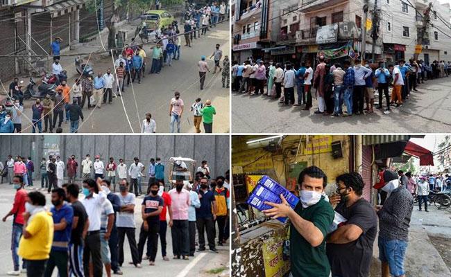Long queues were seen at retail liquor outlets at many places across the state while police had a tough time in controlling the crowd and ensuring social distancing norms.