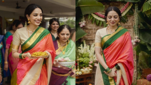 Sobhita Dhulipala and Naga Chaitanya are preparing for their wedding, and Sobhita recently shared some beautiful photos from the pre-wedding ceremony on Instagram. The couple has not announced their wedding date yet, but the festivities have begun with a traditional ritual called ‘Pasupu Danchadam.’ In these images, Sobhita looked radiant, dressed in a coral and green silk saree with a golden blouse. Her look was completed with traditional South Indian accessories like a braid adorned with gajra, gold jewelry, and green bangles.