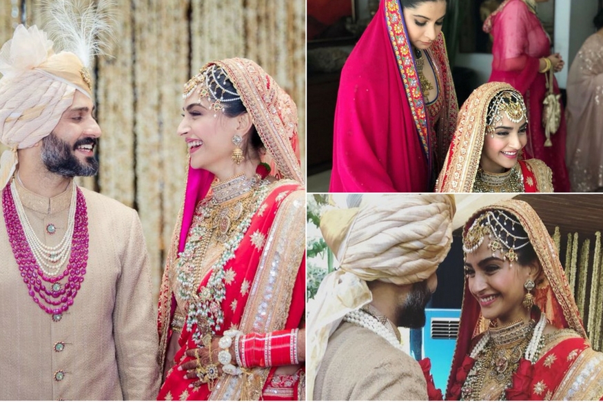 Bollywood fashionista Sonam Kapoor got married to her long-time beau Anand Ahuja today at her aunt Kavita Singh’s bungalow. The wedding was solemnised in traditional Sikh ceremony and was attended by close friends and family. Sonam in a red bridal outfit designed by Anuradha Vakil looked elan. From the Bollywood, from Kareena, husband Saif Ali Khan, and sister Karisma to Karan Johar, then Rani Mukherjee, Ranveer Singh, Abhishek Bachchan and Shweta Nanda Bachchan among others from the attendees.