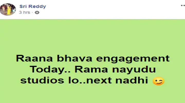 ఇప్పుడు నిశ్చితార్థం ఏర్పాట్లు జరుగుతున్నట్లు తెలుస్తుంది ఈమె. శ్రీ రెడ్డి పోస్ట్ చేసింది. రానా బావకు ఎంగేజ్ మెంట్ ఈ రోజే. రామానాయుడు స్టుడియోలో.. నెక్స్ట్ నాదే అంటూ కన్ను కొట్టే ఇమోజీతో పోస్ట్ పెట్టింది శ్రీ రెడ్డి. ఇప్పుడు ఈ పోస్ట్ వైరల్ అవుతుంది. గతంలో కూడా రామానాయుడు స్టూడియోలోనే తన ఫస్ట్ నైట్ జరిగిందంటూ సంచలన పోస్ట్ చేసింది ఈమె.