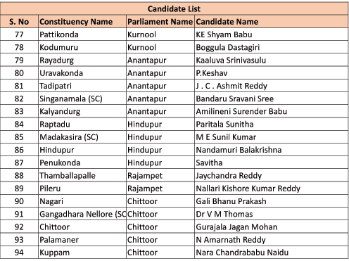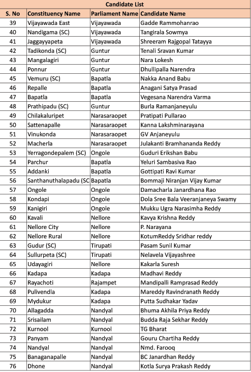 జనసేన పోటీ అభ్యర్థులు: నెల్లిమర్ల నుంచి లోకం మాధవి, అనకాపల్లి నుంచి కొణతాల రామకృష్ణ, రాజానగరం నుంచి బత్తుల బలరామకృష్ణ, కాకినాడ రూరల్ నుంచి పంతం నానాజీ, తెనాలి నుంచి నాదెండ్ల మనోహర్ పోటీ చేయబోతున్నారు