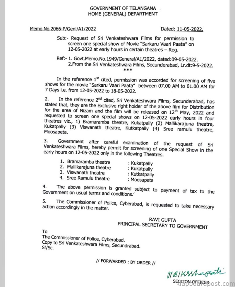 తెలంగాణ రాష్ట్రంలోని హైదరాబాద్ లో కొన్ని థియేటర్లలో స్పెషల్ షోలకు ప్రత్యేకంగా అనుమతినిస్తూ జీవో జారీ చేసింది. నైజాంలో సర్కారు వారి పాట చిత్ర రైట్ హోల్డర్స్ శ్రీ వెంకటేశ్వర ఫిల్మ్స్ వారి రిక్వెస్ట్ మేరకు స్పెషల్ పర్మిషన్ ఇచ్చింది. ఈనెల 12 నుంచి 18 వరకు వారం రోజుల పాటు ప్రతి రోజూ ఐదు షోలకు అనుమతినిచ్చింది. అలాగే స్పెషల్ షోలకు కూడా ప్రభుత్వం అంగీకారం తెలిపింది. ఉదయం నాలుగు గంటలకు ప్రారంభమయ్యే ఈ షోలకు కేవలం నగరంలోని నాలుగు థియేటర్లలకే అనుమతి లభించింది.
