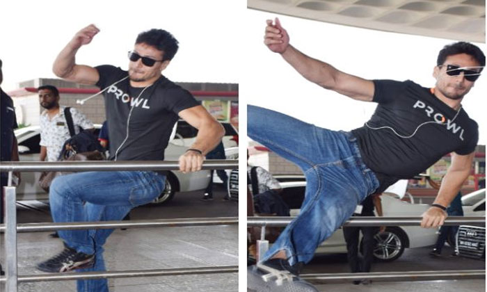 Disha Patani’s rumoured boyfriend Tiger Shroff was seen in Mumbai airport. You must be wondering what’s the big deal in it as celebrities are often snapped at the airports. But Tiger Shroff has made his airport entry a kickass. The actor was clicked by the paparazzi hopping over the railings at the airport and as he lands his earphones are flung across his face. Looks like, Tiger missed his workout day and turned the airport into the gym. Tiger dressed blue denim in a black t-shirt completed the look with a pair of glasses and black shoes.